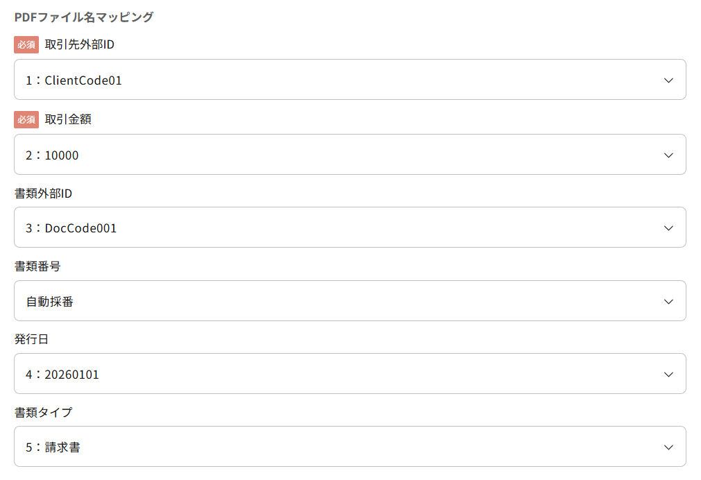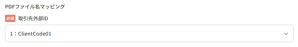 取引先外部IDをファイル名の何番目の項目から抽出するかを指定してください。項目順の番号と、そのうしろにPDFファイル名から読み取った参考の値を元に指定します。