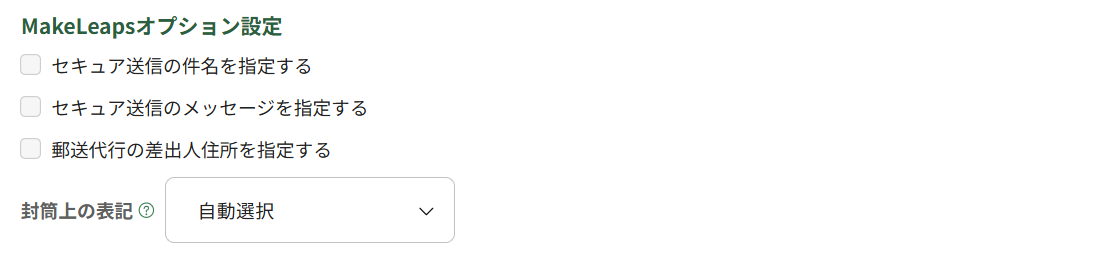 ここで設定しないとき、郵送代行の封筒上の表記には「内容物表記なし」が設定され、セキュア送信の件名とメッセージには取引先設定で指定した文言が設定されます。セキュア送信の件名、メッセージのデフォルト設定を参照してください。