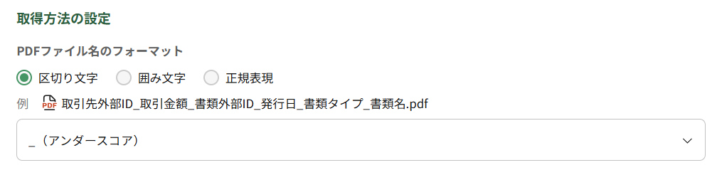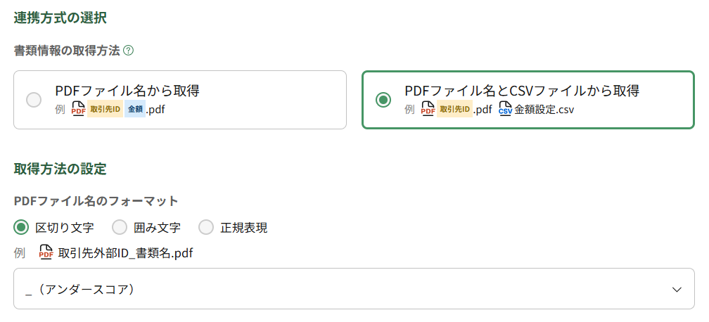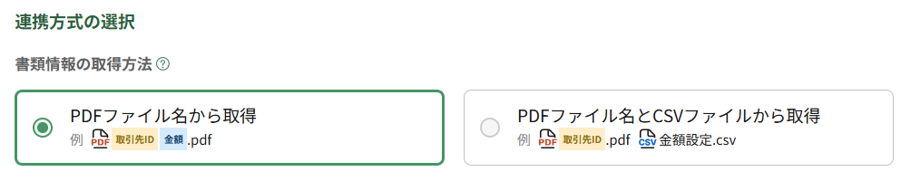 書類情報の取得方法において、「PDFファイル名とCSVファイルから取得」を選択し、PDFファイル名のフォーマットのいずれかを選択します。