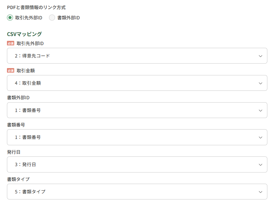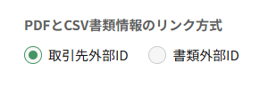 CSV方式を選択した場合、PDFとCSVの各行に記載した情報を紐づけるためのキー項目が必要になります。紐づける項目として、取引先外部IDと書類外部IDのいずれかを選択できます。 これは、CSVファイルにある取引先外部IDか書類外部IDのいずれかを基にPDFファイルを特定するための設定です。