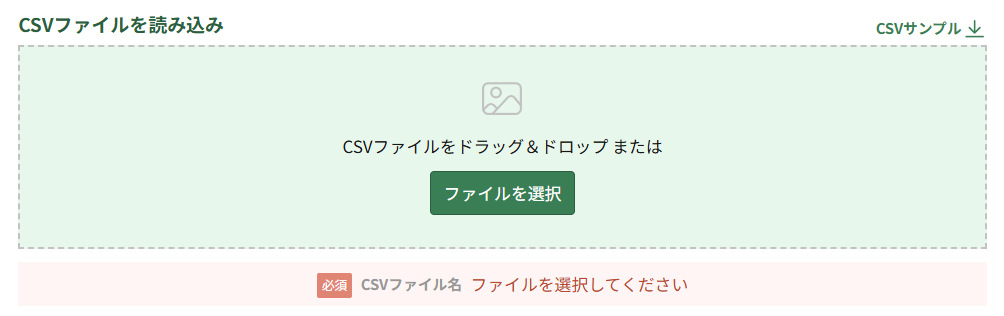 「ファイルを選択」ボタンを押し、CSVマッピングに使うためのCSVファイルを選択します。CSVファイルをドラッグ&ドロップで追加することも可能です。