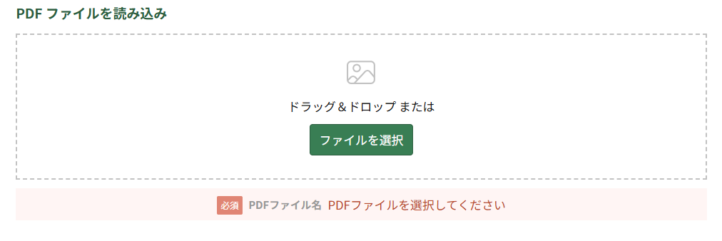 「ファイルを選択」ボタンを押し、PDFファイル名マッピングに使うためのPDFファイルを選択します。PDFファイルをドラッグ&ドロップで追加することも可能です。