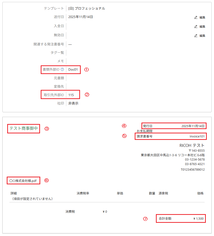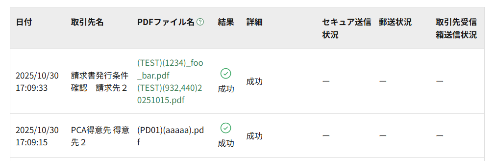 MakeLeaps書類として作成しなかった際に取引先が受領した際にダウンロードするPDFファイル名は、アップロードしたPDFファイル名から、取引先外部IDの要素を削除したものとなります。
