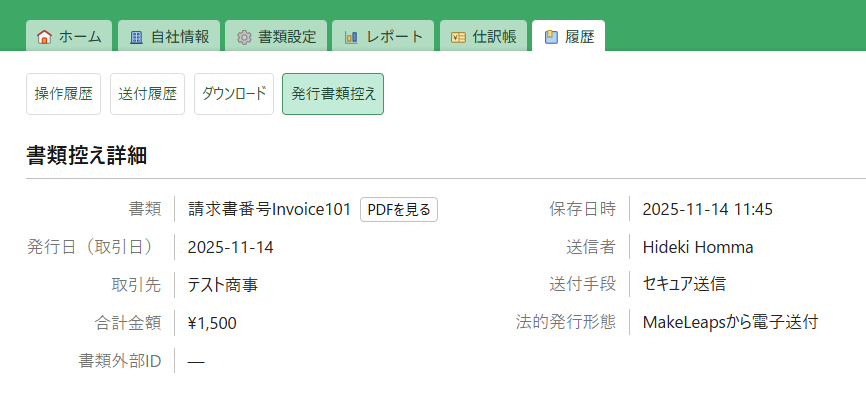 MakeLeapsにおいて、送付依頼を送信すると発行書類控え情報が作成されます。